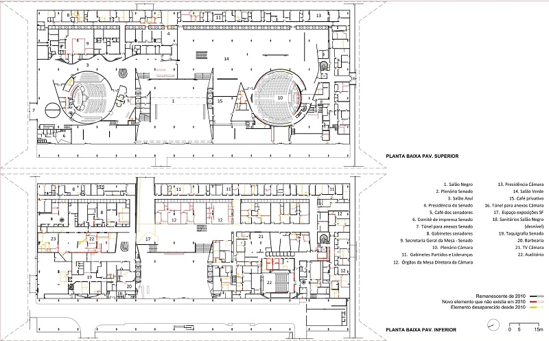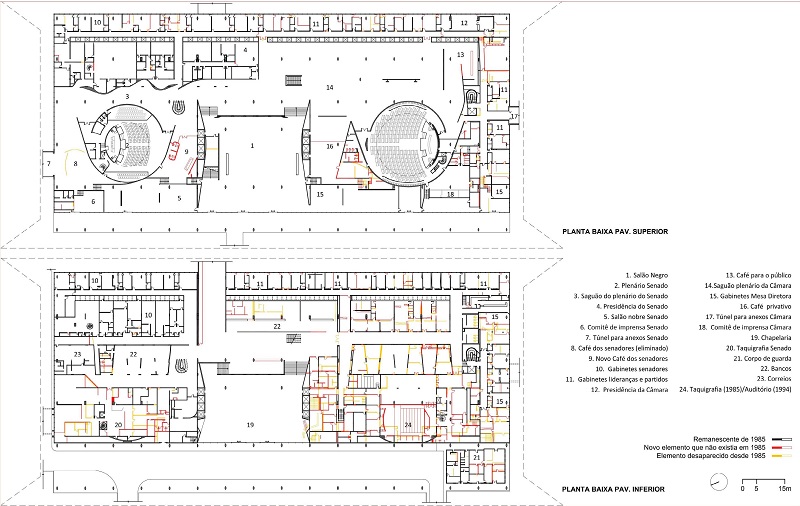 As pranchas-síntese dos períodos 1985-1994 e 1994-2010 mostram a continuidade do processo descrito. No pavimento superior, sucedem-se reformas nos cafés dos Senadores e dos Deputados, nos Comitês de Imprensa, Presidências e gabinetes parlamentares de ambas as casas. No pavimento inferior, repetem-se as reformas nos gabinetes, bancos e Taquigrafias – no caso da Câmara, esta última foi ocupada por órgãos de comunicação institucional (Figuras 15 e 16 ). Nesses 25 anos, assim como nos 25 anteriores, a maioria dessas áreas foi reformada duas vezes. Enquanto isso, o Salão Branco permaneceu com sua configuração de inauguração, e os plenários, Salões Nobres, Salão Azul, Salão Verde e Salão Negro mantiveram a configuração aproximada adquirida na década de 1970.