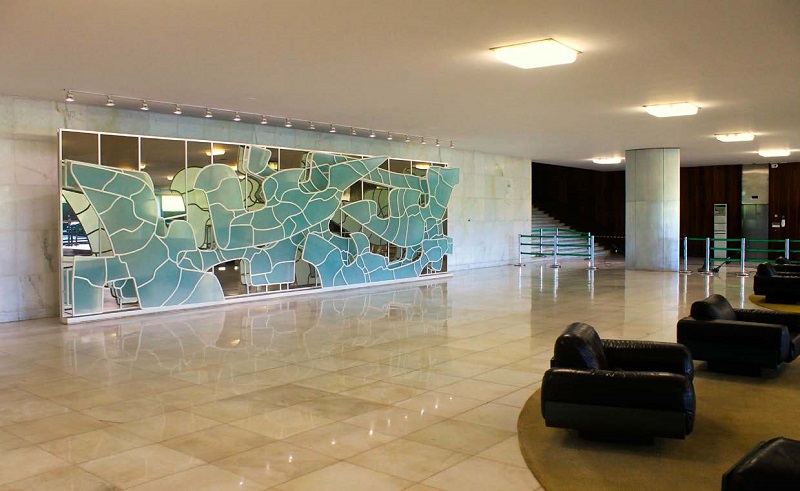 As obras de arte que foram sendo integradas à arquitetura tiveram papel relevante na nova configuração do edifício. Até 1970, este dispunha apenas do painel de Athos Bulcão, no Salão Negro, e da tela de Di Cavalcanti, no saguão da Câmara dos Deputados. 61 Ao longo da década, multiplicaram-se os painéis de Athos Bulcão e Marianne Peretti. O Salão Verde exemplifica como não se trata de mera acumulação de obras, mas de adições integradas à concepção arquitetônica: enquanto o muro-divisória de Bulcão isola o Hall dos Deputados, o painel semitransparente de Peretti substitui os septos em mármore, dando mais fluidez ao espaço e ajudando a equilibrar a perda da transparência para o exterior.