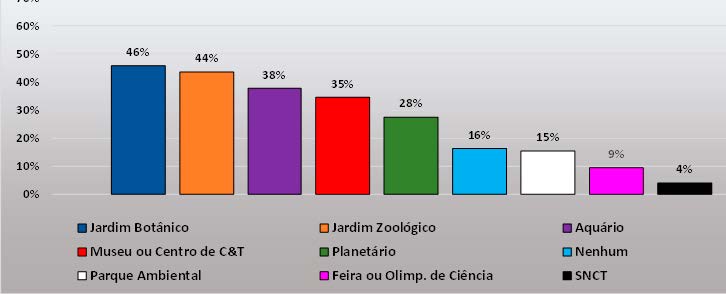 No Gráfico 1 , sobre os espaços ou eventos científicos culturais frequentados nos doze meses anteriores a este estudo, constatamos que Jardim Botânico e Zoológico são os mais citados. Isso confirma sua posição enquanto local de lazer cultural, tradicional das famílias, nos finais de semana. Aquário, Museus e Centros de C&T e Planetário mantêm um percentual de visitação próximos, entre 16% e 12%. Já os acontecimentos como Feiras ou Olimpíadas e a Semana Nacional de C&T (SNCT), por serem pontuais e de curta duração, podem explicar os menores percentuais observados.