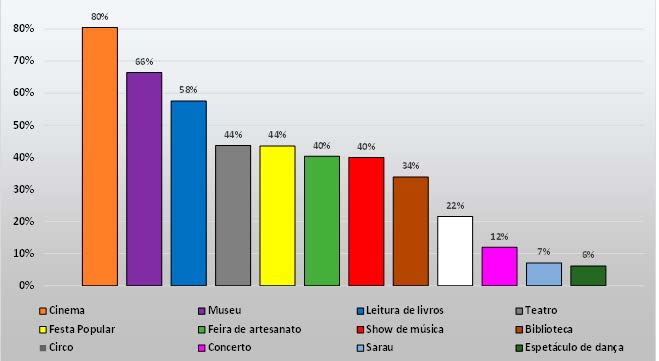 No que tange às práticas culturais apontadas pelos participantes nos doze meses anteriores à visita, o Gráfico 2 mostra que a ida ao cinema é a atividade mais citada (80%) seguida de visita a museus (66%) e leitura de livros (58%). Já teatro, festa popular, show de música e feira de artesanato são atividades mencionadas por 44%, 44%, 40% e 40% dos respondentes, respectivamente, evidenciando que esse público exerce suas práticas culturais com regularidade.