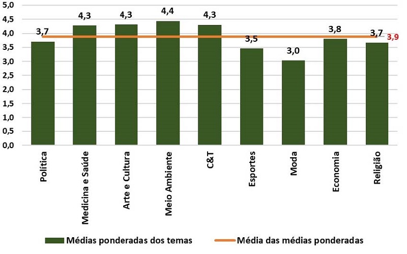 As médias ponderadas (MPs) apresentadas no Gráfico 3 , considerando os cinco graus de interesse, foram a abordagem escolhida para sustentar a análise dos dados. A média geral das MPs posiciona o grau de interesse da amostra no indicador 3,9 (elevado) e destaca os assuntos meio ambiente (4,4), medicina e saúde, CT e arte e cultura (4,3) como preponderantes. Moda (3,0), esportes (3,5), política e religião (3,7) são os de relevância abaixo da média geral (3,9).