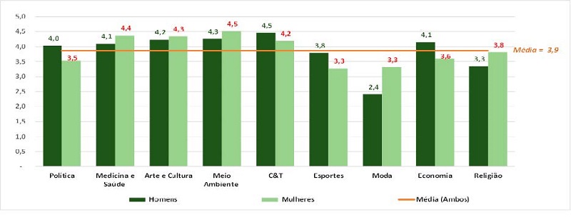 A prevalência na amostra da pesquisa é de mulheres, que se mostram mais interessadas por medicina e saúde, arte e cultura e meio ambiente, embora a diferença em relação aos homens seja pequena ( Gráfico 4 ). Os interesses manifestados por alguns temas foram marcados por homens com maior intensidade, como CT, política, esportes e economia. A maior diferença em grau de interesse pela variável sexo ocorreu no tema moda, em que a avaliação masculina (MP=2,4) teve pontuação abaixo do ponto central da escala e a feminina foi de 3,3. Nota-se que o assunto moda não alcançou a média geral da MP da amostra, que foi de 3,9, o que significa que, mesmo para as mulheres, não se evidencia uma preferência importante dos visitantes.
