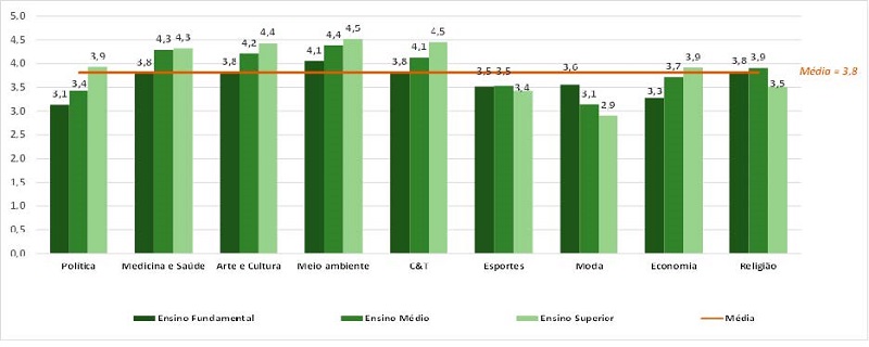 No estudo populacional, foi observada uma queda nos últimos anos no interesse declarado em temas como esportes, artes e cultura, economia e, de forma menos acentuada, religião. As prioridades se mantiveram estáveis: os três temas que os brasileiros consideram de maior interesse continuam sendo medicina e saúde, meio ambiente e religião. Em 2019, os índices foram de 79%, 76% e 69%, respectivamente, e 62% dos respondentes estão interessados ou muito interessados em algum assunto relacionado à “ciência e tecnologia” 29 .