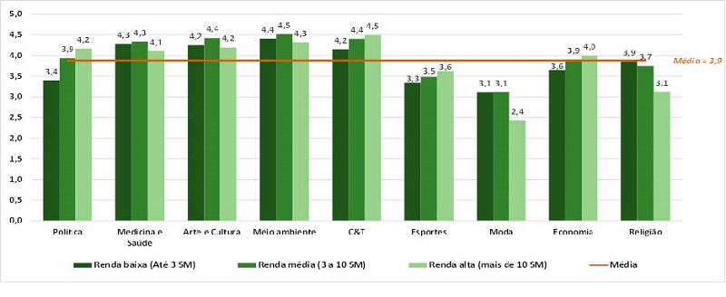 O Gráfico 6 traz a variável faixa de renda como recorte, que na amostra desta pesquisa teve maior frequência na renda baixa, para comparação dos graus de interesse dos respondentes pelos temas propostos. Embora existam diferenças entre as médias ponderadas dos temas posicionados acima da média geral da MP, observa-se que não chegam a ser marcantes, ficando em torno de 0,2 pontos. Observações relevantes aparecem nos temas política, em que é evidenciado o menor interesse dos que se declararam de baixa renda, no tema moda, em que os respondentes de alta renda não se mostraram interessados e no tema religião, também com a menor média na faixa alta de renda. Contudo, nota-se que os temas medicina e saúde, arte e cultura, meio ambiente e CT apresentam níveis de interesse acima da média geral da MP, independentemente da faixa de renda.