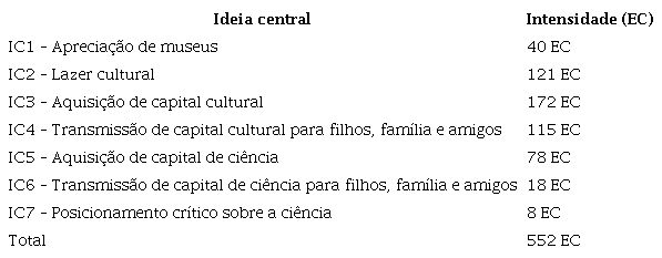 A análise qualitativa das 498 respostas fornecidas pelos questionários à pergunta aberta “Por que você visita museus de ciência?” nos permite inferir 552 EC, distribuídas nas sete IC, conforme os DSC: