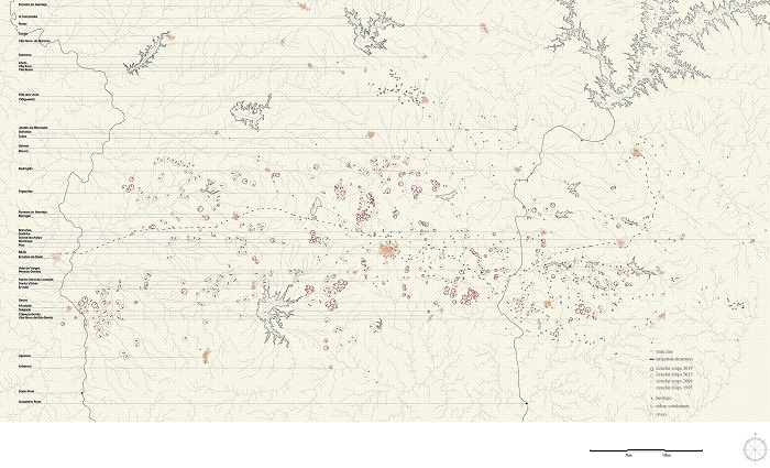 This process enabled us to define strategies that radically counter the homogenous production of space and the planetary urbanization that have been overtaking the countryside. Through a large-scale design we envision alternative ways of inhabitation, reconnecting the space of the city to the hinterlands that support its existence. Based on a disruptive process we proposed the implementation of autonomous nuclei of human occupation and production, that challenges the current social and spatial organization of the countryside. Arguing in favor of a landscape shaped by its historical continuity we designed a completely new system from the presence of the regional heritage. With this we came up with a proposal which morphogenesis is based on operational and historical arguments, reconciling nature, culture, production and human occupation.