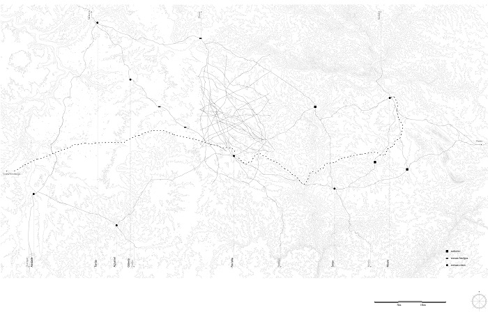 Aiming to establish a net based on the landscape’s historical continuity, we developed an analysis of the ancient routes that might have structured this territory (Figure 26). In order to achieve this goal, we first analyze the traces of ancient routes drawn by Lavigne,71 identifying among them the ones that still are somehow recognizably. The exact routes are extremely difficult to define, as their layout often depends on varying factors such as weather conditions, the season, or the nature of the goods being transported. This is the main reason why Cedric Levigne identifies several ancient paths that partially overlap, with traces that differ slightly from one another, even though their main direction or final destinations remain the same. From this understanding, we propose a differentiation between active and semi-active paths, allowing us to establish a clearer picture of the evolving transpassivity of these routes over the centuries. Expanding this analysis to our territory of experimentation, we developed a drawing that serves as a tool to define a contemporary network of paths, providing a framework from which the system must be structured (Figure 27).