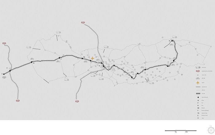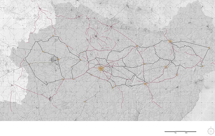 From the definition of the itineraries, we propose the reconfiguration of the borders in order to improve the interaction between the fields and the mobility system (Figure 29). As a result, the final mobility system (also linked to the national railway system and to the airport network) increases accessibility to the heritage goods, interconnects productive landscapes to urban settlements, and boosts the contemporary development of the region (Figure 30).