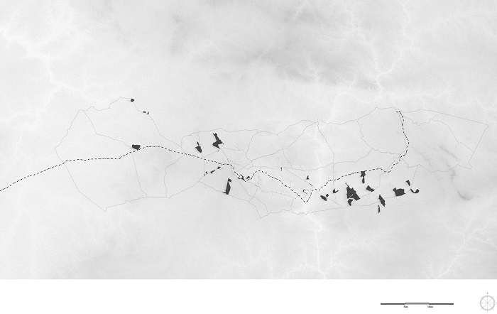 By proposing an agrarian reconfiguration that fragments the ownership in Alentejo, the project prompts the appearance of autonomous modes of inhabitation that do not only aim to promote social and economic development for the region but to rescue its historical and identity values. Thus, the location of roman villas50 become central points of a new meaningful and operational net of spaces, overlapped to the current territorial structure, and organized along the historical east-west axis of the meridional region of Alentejo.