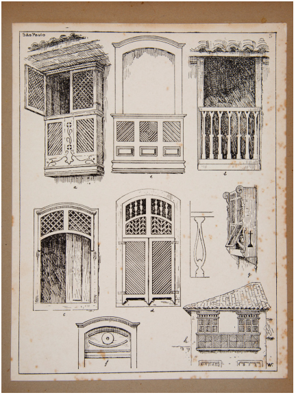 A obra inicia-se com representações da arquitetura colonial e imperial paulista, protagonismo que talvez se relacione com uma opção da casa que a publicou - a Livraria Martins Editora -, sediada em São Paulo. Baseando-se em construções remanescentes, no caso de Santana do Parnaíba e, para a cidade de São Paulo, em antigas fotografias de Militão Augusto de Azevedo34 realizadas na década de 1860, Wasth Rodrigues concedeu um evidente destaque às janelas de rótulas e balcões fechados por rótulas, representados com ênfase na estampa 1 (Figura 8). O destaque a esses elementos foi justificado pelo artista no texto que acompanha essa prancha, em que declara serem os balcões cerrados um traço identitário da capital paulista: “O muxarabiê, proteção de rótulas sobreposta e apoiada ao balcão, também de rótulas, deve ter sido muito comum em São Paulo, devendo mesmo ser considerado um elemento característico dessa cidade”.35