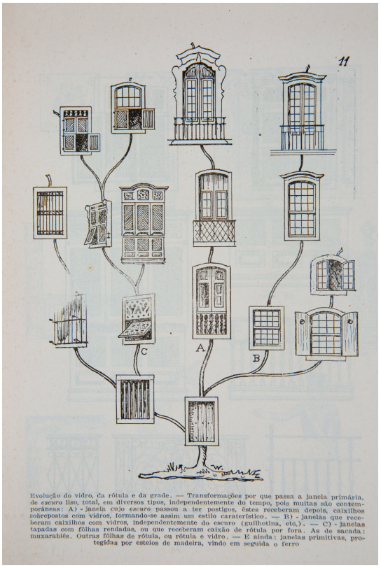 No ano seguinte ao início da edição do Documentário arquitetônico, Wasth Rodrigues publicou o artigo “A casa de moradia no Brasil antigo” no número 9 da Rphan, o mesmo em que fora editado o artigo de Robert Smith sobre as rótulas baianas. Pode-se considerar a edição desse artigo como uma forma de chancela do Sphan ao empenho do autor em editar o Documentário arquitetônico a partir de 1944. No artigo, Wasth Rodrigues dissertou sobre os diversos aspectos da arquitetura civil a que se dedicara nas páginas do primeiro fascículo do Documentário arquitetônico. Tal qual fizera por meio de imagens na já mencionada prancha 5 do Documentário, o artista deteve-se mais uma vez em detalhar as tipologias do uso de rótulas em janelas e balcões, criando, para esse artigo, uma inusitada árvore genealógica das janelas brasileiras, em que as treliças têm grande destaque (Figura 11).