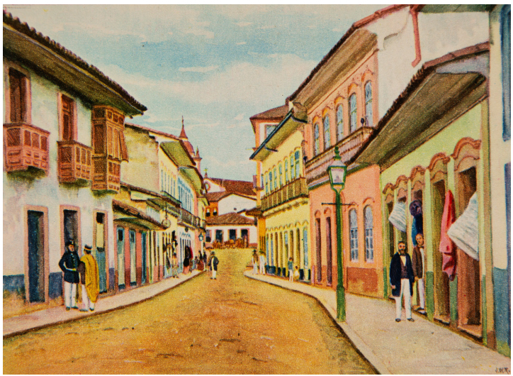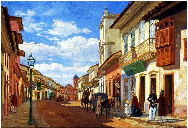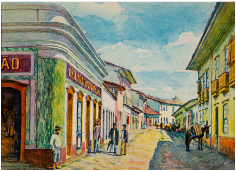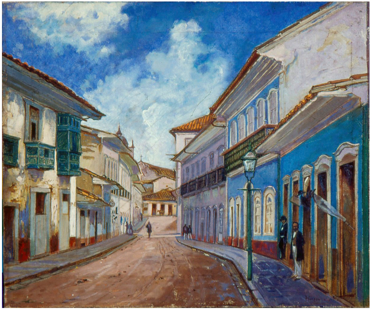 José Wasth Rodrigues realizou catorze dessas encomendas em telas a óleo,40 sendo uma delas dedicada ao Paço Municipal, que apresenta uma releitura livre do edifício que representava a vila, presente no mapa de Céspedes Xeria, localizado no Arquivo das Índias, em Sevilha. Todas as demais são inspiradas em fotografias de Militão de Azevedo, sendo a maior delas denominada Rua do Rosário em 1858, que foi realizada em 1920 (Figura 12).