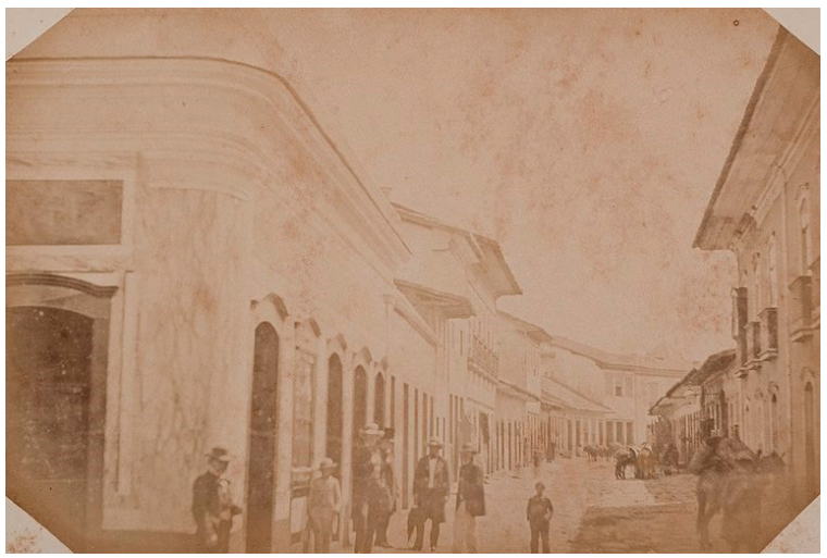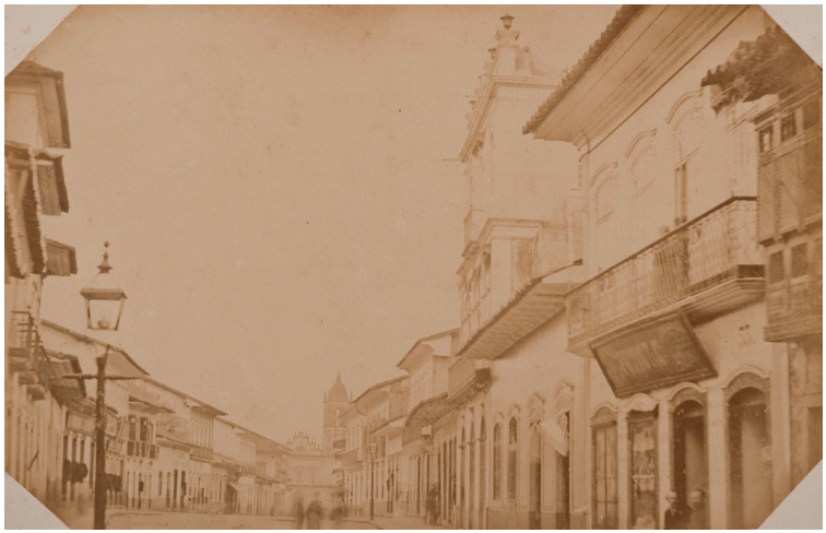 Para realizar essa pintura, Wasth Rodrigues utilizou como referência uma fotografia de Militão de 1862 (Figura 13). A confrontação entre essas duas imagens permite constatar as muitas subtrações e acréscimos que caracterizavam a “transcodificação” apontada por Lima e Carvalho. Diversos personagens que não estavam presentes na fotografia são acrescidos à tela, compondo uma síntese da sociedade regrada que realçava uma ordem urbana materialmente disciplinada, denunciada pela distinção entre calçadas, sarjetas e leito carroçável - sinais de urbanidade trazidos das cidades europeias que já estavam na fotografia de Militão. Na visão das sociabilidades urbanas idealizada por Wasth Rodrigues, uma senhora caminha acompanhada de uma menina com trajes de passeio inspirados na moda europeia de meados do oitocentos, um militar empunhando uma espada conversa serenamente com um homem de casaca e cartola, um escravo descalço caminha carregando sua tarefa, um cavaleiro com o poncho típico dos tropeiros descobre a cabeça para saudar uma pessoa que trafega no banguê. Assim, a civilidade manifesta-se não apenas pelas calçadas e postes de iluminação pública, mas pela cortesia e pelo regramento dos ordeiros súditos do Império ali inseridos.