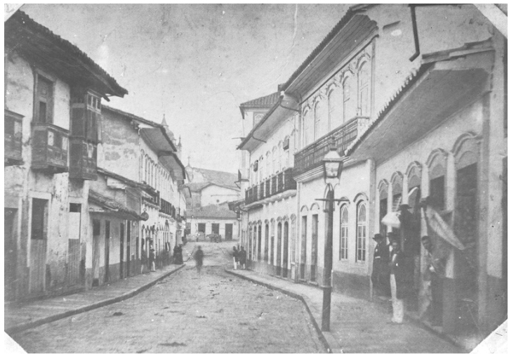Até 1857, o sobrado pertencera à finada Maria Miquelina Fortes Leite, herdeira das chamadas “mocinhas da casa verde”, as sete irmãs solteiras do General José Arouche de Toledo Rendom, que residiam em um sobrado na travessa do Colégio. Dali administravam um amplo patrimônio imobiliário na cidade, que alugavam para obterem rendas. O sobrado decadente, herdado por Maria Miquelina, assim como os quartos térreos anexos, situados à direita do sobrado, eram, na fotografia de Militão de Azevedo, um claro contraste aos que lhe faceavam no outro lado da rua, ornados com gradis de ferro corridos ou segmentados em balcões, com vidraças e uma modenatura marcada pela predominância de portas e janelas sobre as paredes externas, sendo esses vãos em rigorosa simetria, de acordo com o gosto clássico que se generalizava em Portugal e no Brasil desde fins do século XVIII. Nesse sobrado, instalava-se em 1862 um fabricante de chapéus, Carlos Schumacker, e, nas casas térreas, o açougue de João Antônio de Borba Cujo,58 ambos muito distantes de qualquer evocação senhorial que a pintura em aquarela de Wasth Rodrigues indicava para o sobrado.