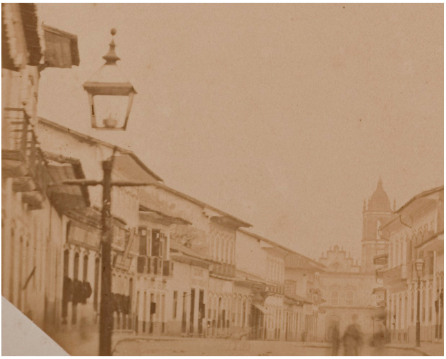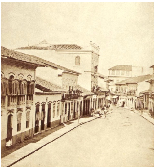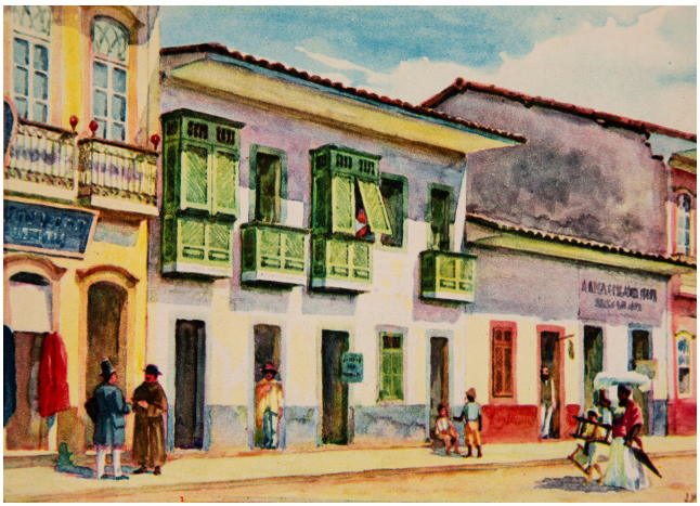 Em frente à Confeitaria do Leão, erguia-se um vasto sobrado com enorme beiral, portando seis balcões no piso superior. Quatro deles apresentam guarda-corpos em rótulas com vidraças superiores e dois deles portam os balcões cerrados, os muxarabis. O faceamento desse sobrado com seu vizinho reforça de modo exemplar o contraste de modus vivendi da cidade em meados do século XIX, e essa assimetria arquitetônica - que é também uma simetria temporal - não escapara a Militão de Azevedo quando a fotografara, e também não a Wasth Rodrigues. Entre tantas vistas fotográficas das ruas da cidade nessa década, o pintor a escolheu para figurar em uma de suas aquarelas. reforçando a assimetria presente na paisagem arquitetônica em outras que posicionou no próprio leito da rua, por meio da inclusão de mulas tropeiras em contraste com o estabelecimento comercial marmorizado e com homens em trajes europeus, um deles portando um guarda-chuva.