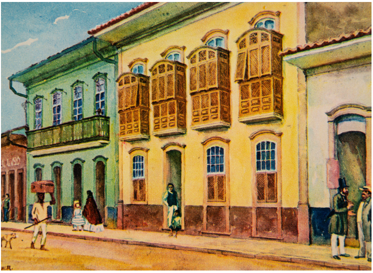 A aquarela o representa perfeitamente conservado, portando dois balcões apenas com guarda-corpos de rótulas verdes e outros totalmente cerrados, um deles com o postigo afastado para frente, de onde se entrevê uma figura incerta, que se pode supor ser uma mulher. A aquarela apresenta ainda vários personagens que configuram uma coleção de tipos humanos que deveriam revelar aos olhos de 1954 os comportamentos da São Paulo antiga, semelhante à operação que o pintor representara na tela Rua do Rosário em 1858, que Wasth Rodrigues realizou por encomenda de Afonso Taunay (Figura 12). Vê-se um tropeiro com poncho e chapéu na porta do sobrado, cujo térreo abrigava uma loja, uma quitandeira passando com seu tabuleiro e guarda-chuva, auxiliada por um menino que carrega as peças de madeira para sustentar seu comércio, além de um padre e um homem de casaca e cartola, que conversam na calçada. A senhora branca entrevista no muxarabi compõe essa galeria de personagens urbanos, representada pelo pintor não em um dos balcões descobertos, mas em escolha proposital, semivisível atrás do postigo, numa releitura de imagens semelhantes realizadas no século XIX por Debret, Chamberlain e Theremin para casas térreas.62