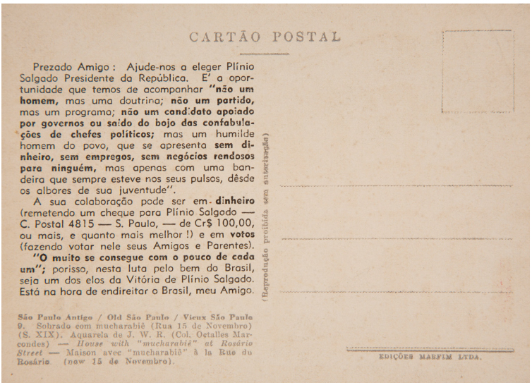 No sobrado “restaurado”, o pintor figurou seus dois balcões cerrados por postigos de rótulas, um deles entreaberto pela mulher que buscava manter seu recato. Após uma contundente digressão sobre a retidão do candidato “sem dinheiro, sem empregos, sem negócios rendosos para ninguém”, da candidatura “não de um homem, mas de uma doutrina”, e de um inescapável pedido de auxílio financeiro aos que liam o postal, o possível eleitor da metrópole paulista, ou de qualquer brasileiro que o recebesse, é brindado com um desfecho que ecoava a mensagem ilustrada por Wasth Rodrigues e que expressava a síntese imaginária de uma velha ordem social e material vinda dos tempos da colônia, e que, para o antigo integralista, deveria iluminar o futuro nacional: “Está na hora de endireitar o Brasil, meu Amigo”.