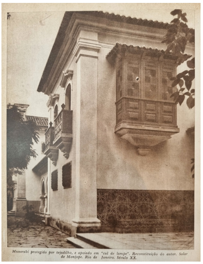 Gelosias e muxarabis foram adotados em incontáveis residências neocoloniais, incluindo-se a casa de praia de Severo, no Guarujá (SP), a casa de Numa de Oliveira, na avenida Paulista, e o célebre Solar Monjope, a morada carioca de José Mariano Carneiro da Cunha Filho, na rua do Jardim Botânico, considerado o exemplo doméstico de maior expressão erguido por essa corrente arquitetônica na então capital nacional.16 A adequação climática gerada pela proteção dos raios solares e permeabilidade às brisas frescas foram as razões mais correntes para sua adoção, pelo que se celebrava a sabedoria dos velhos brasileiros em adequar as moradias aos extremos do clima tropical, aspecto “mesológico” que foi intensamente destacado por José Mariano Filho em sua obra Influencias muçulmanas na architectura tradicional brasileira, publicada em 1943, em que constava um foto de sua residência com diversos balcões de rótulas (Figura 5).