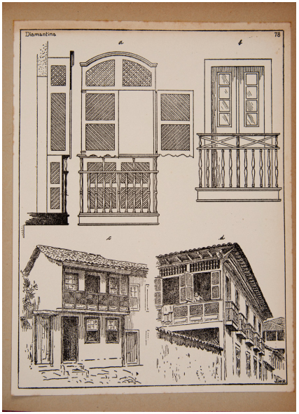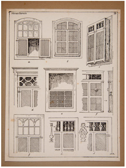 Composto de pranchas com representações de edifícios e sobretudo de detalhes arquitetônicos, o Documentário arquitetônico foi o primeiro repertório descritivo extenso da arquitetura brasileira dos séculos coloniais e imperial a chegar a público. Nele, Wasth Rodrigues deu grande destaque às rótulas em gelosias, guarda-corpos ou balcões cerrados, chegando a figurar duas vezes o muxarabi de Diamantina, além de numerosas ocorrências em Ouro Preto, Tiradentes, Rio de Janeiro e São Luís (Figuras 6 e 7).