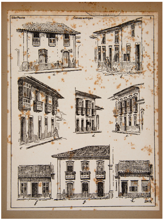 Wasth Rodrigues representou, na estampa 1, um sobrado ainda hoje existente no largo da Matriz de Santana de Parnaíba, bem como casas térreas paulistanas já demolidas em que as rótulas guarneciam janelas, abrindo tanto por dobradiças superiores quanto laterais. Além disso, figurou no centro da prancha três sobrados da rua da Imperatriz (antiga rua do Rosário) e um sobrado ao lado da igreja de São Pedro dos Clérigos, com balcões de guarda corpo em treliças.