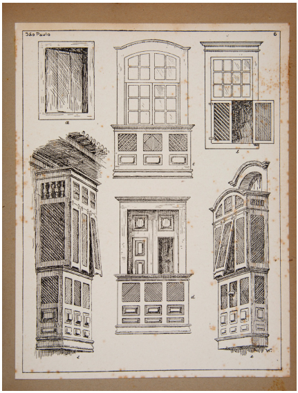 O mesmo destaque aos balcões de rótulas paulistas foi dado nas estampas 6 e 5 (Figura 9 e 10). Na primeira, Wasth Rodrigues representou em detalhe os balcões da Casa do Bispo (item “c”), os balcões cerrado e aberto do sobrado da rua do Rosário, que aparecera na estampa 1 como item “c”, e de um sobrado da rua da Quitanda com a rua do Comércio. Na estampa 5, representou, no item “a”, o balcão que guarnecia o sobrado de Parnaíba, que constava da estampa 1. Já no item “b”, o artista figurou um dos balcões que existiam em um outro sobrado situado no mesmo largo da Matriz de Parnaíba, contíguo à residência térrea chamada Casa do Anhanguera, construções que viriam a ser tombadas pelo Dphan em 1958.36