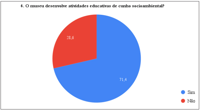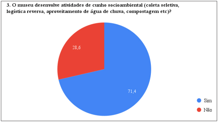 A proposição da terceira pergunta objetivou produzir dados sobre a execução do PSA por meio da verificação da realização de atividades de cunho socioambiental. O cotejo dos dados, exposto no Gráfico 2, demonstra a coerência nas respostas e o compromisso das entidades na implantação das propostas de seus respectivos planos museológicos.