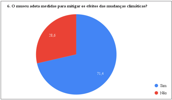 A sétima questão (“Quais medidas são adotadas para mitigar os efeitos das mudanças climáticas?”) foi respondida apenas por dois museus da amostra. Desse modo, os resultados apresentados correspondem a 28,5% da amostra total. O primeiro museu a responder à pergunta em tela confirma a realização da coleta seletiva e denuncia que ela não é efetiva, visto que a municipalidade, no estado de Minas Gerais, não prevê a separação de lixo.