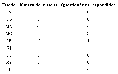 A primeira pergunta, fechada, tratou de explicitar a entidade participante da pesquisa. Foram elas: Museu da Abolição, Museu de Arte Religiosa e Tradicional de Cabo Frio, Museus Castro Maya, Museu Imperial, Museu Histórico Nacional, Museu Regional Casa dos Ottoni e Museu Regional de Caeté. Portanto, o panorama da amostra analisada, em relação ao universo dos museus do Ibram, corresponde à composição de uma amostra com 23% do universo total, podendo ser exposta no Quadro 1: