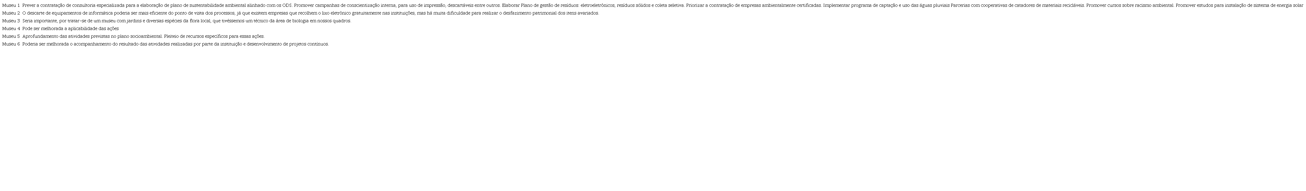 Cabe ainda destacar o retorno de três museus, que sinalizam a necessidade de melhorar “a aplicabilidade das ações”, de aprofundar “as atividades previstas no programa socioambiental” e de melhorar o “acompanhamento das atividades realizadas por parte da instituição e desenvolvimento de projetos contínuos”. Sugerimos que tais respostas se relacionam à porção menor do panorama mapeado pelos resultados da questão 5 da ferramenta de coleta de dados deste estudo, uma vez que a proposição das melhorias indicadas pelas entidades resulta da avaliação das ações.