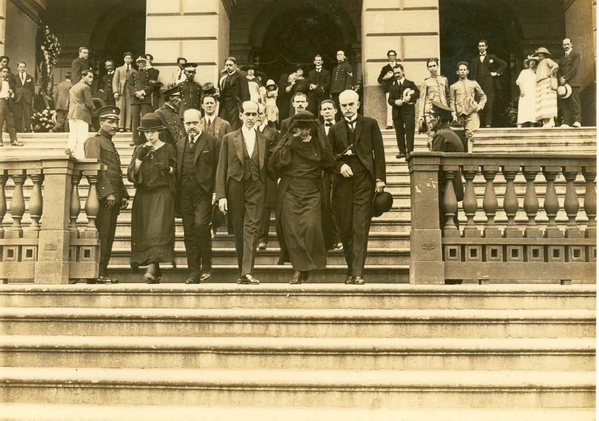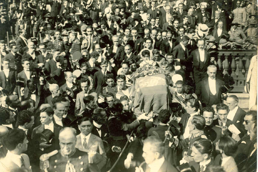 As fotos registraram a bandeira com estrelas muito maiores do que o padrão,6 justamente a bandeira que ficou com Antônio Joaquim da Costa, e não com a viúva, Maria Augusta (Figura 2). Teria outra bandeira saído do chalé de Petrópolis sobre o esquife, no cortejo do dia 2 de março? No jornal A Noite de 5 de março de 1923, encontramos uma nota sobre qual havia sido o itinerário do funeral, desde o primeiro até o segundo velório: o leito na “casa do descanso” em Petrópolis; em seguida a saída do corpo já embalsamado; o cortejo pelas ruas de Petrópolis; a chegada à estação de trem; o translado do corpo para o Rio de Janeiro pela Leopoldina Railway até a estação Praia Formosa, onde se iniciou grande cortejo até a Biblioteca Nacional. Da Biblioteca Nacional partiria o terceiro cortejo até o cemitério São João Batista, em 4 de março de 1923, com a única bandeira fotografada.