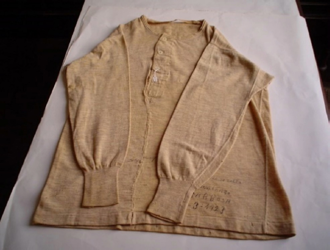 Outra situação que nos chamou a atenção durante o estudo é que apenas duas fichas citam um envelope com a seguinte mensagem: “Lencinho que/ cobriu o rosto do/ meu idolatrado/ e inesquecível/Paesinho 1° Março 923”. Por fim, na própria camisa de malha de lã bege e forro em malha de algodão, com monograma RB, há a seguinte frase manuscrita: “com esta camisa no corpo / morreu o conselheiro / Rui Barbosa / 1-3-1923” (Figura 15).