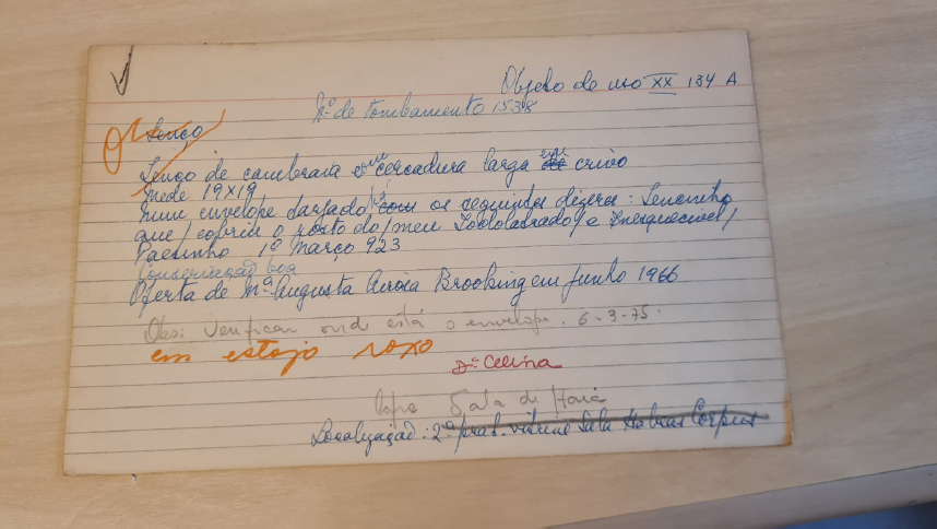 O lenço que cobriu o rosto de Rui Barbosa possui ao menos três tipos de fichas museológicas, uma está manuscrita, e as outras são datilografadas. Apesar de serem referentes ao mesmo objeto, os documentos registram informações divergentes sobre o estado de conservação. Um diz que o estado de conservação é “mau” (Figura 12) em data não informada, outro diz que é “bom” (Figuras 13 e 14), sem relatar procedimento de restauro.