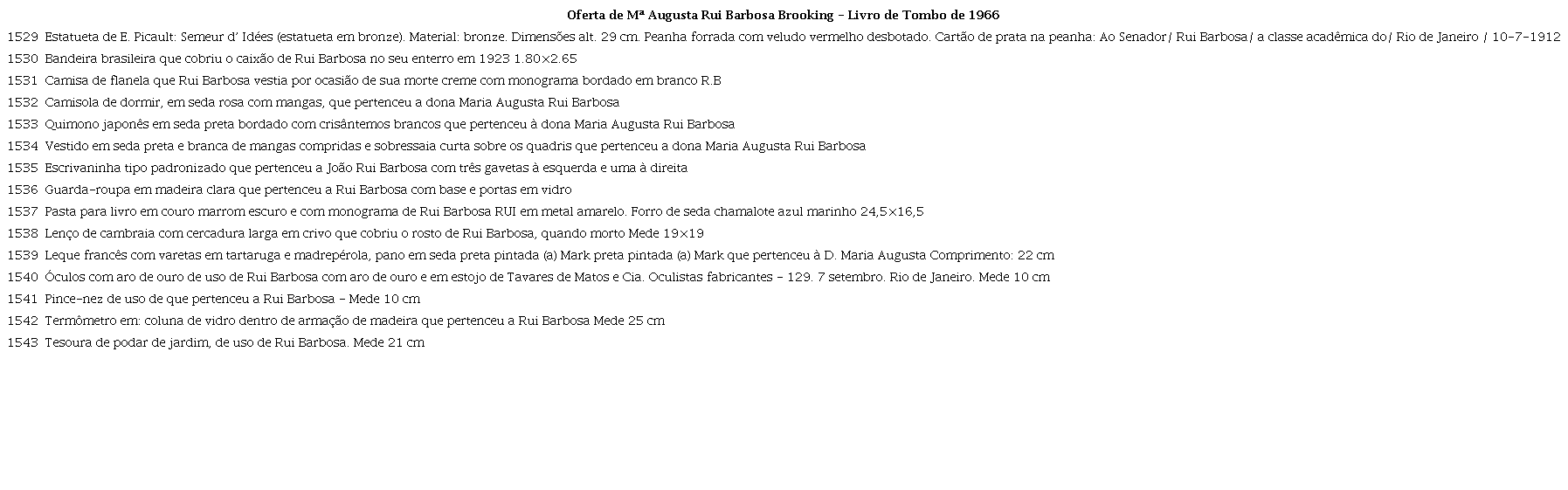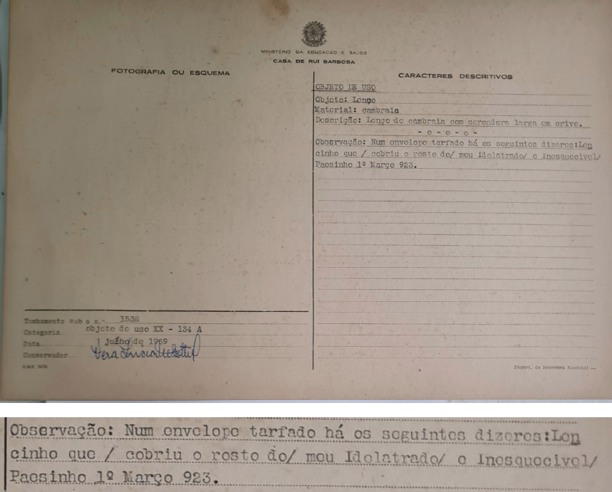 Inicialmente, entendemos esses itens que a viúva não doou como parte do conjunto relacionado à morte de Rui Barbosa, mas a significância da decisão de não doar merece um pouco mais de reflexão. Poderia esse lote de 1966 ser estudado como um “Conjunto Luto” dentro de uma provável Coleção Maria Augusta Rui Barbosa?