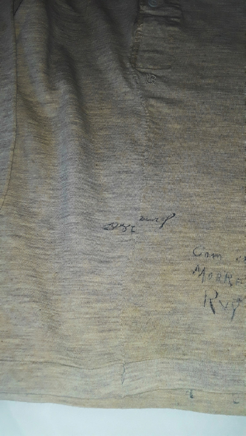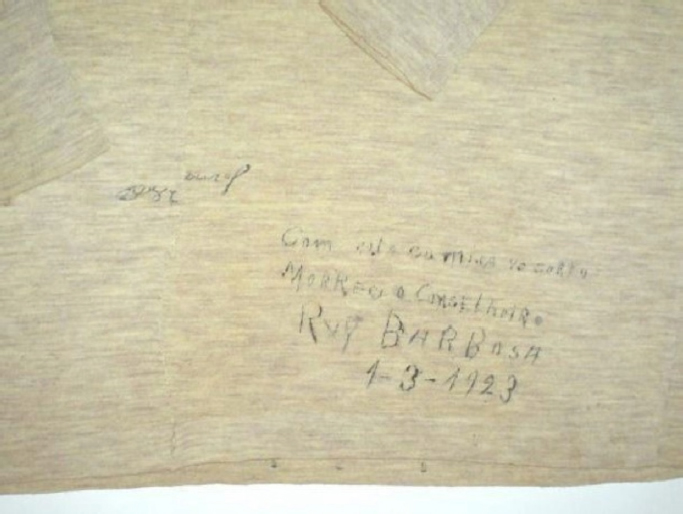 A camisa foi incorporada ao acervo museológico já com a inscrição, e o texto expressa cerimônia ao invés de intimidade. É possível que tenha sido riscada no momento da comoção por alguém que participou dos últimos momentos ou até da troca de roupa nos preparativos do corpo, ainda em Petrópolis. Não há relatos de memória sobre isso, mas há uma assinatura de Rui logo acima desse manuscrito sobre a morte. Na Figura 16, é possível observar que a assinatura de Rui foi cortada ao meio, portanto a camisa já estava assinada antes de ser cortada, e a assinatura ficou desencontrada depois do chuleio.