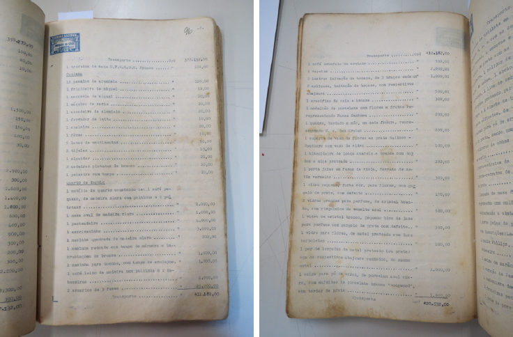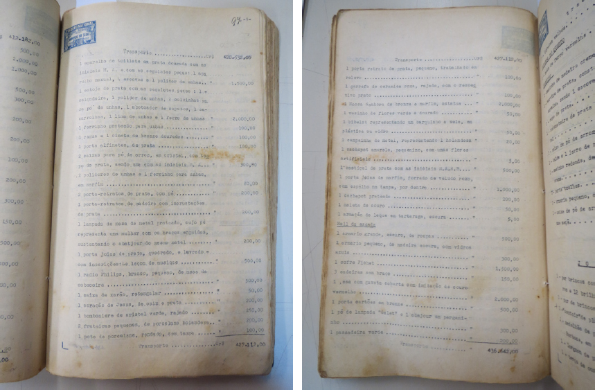 Restava analisar por que as roupas e acessórios de dona Maria Augusta chegaram ao museu junto com esse lote de objetos. Na casa da Raimundo Correia, em Copacabana, onde dona Maria Augusta passou a morar após deixar a residência da São Clemente, o avaliador de bens do seu inventário26 não relacionou nenhum desses itens, em 5 de setembro de 1948, em nenhum dos seguintes cômodos vistoriados: varanda de baixo, jardim, sala de visita, sala de jantar, copa, cozinha, quarto de dormir, hall da escada, varanda do quarto e banheiro. Ao consultar as folhas 8 e 9 (Figuras 17 e 18) da relação apresentada pelo avaliador de bens, juntadas ao processo como folhas 96 e 97 do Inventário Maria Augusta Rui Barbosa, é possível identificar o conteúdo que havia na mobília da cozinha, os objetos do quarto, expostos, e “dois armários de três faces” também no quarto: