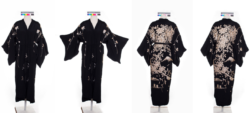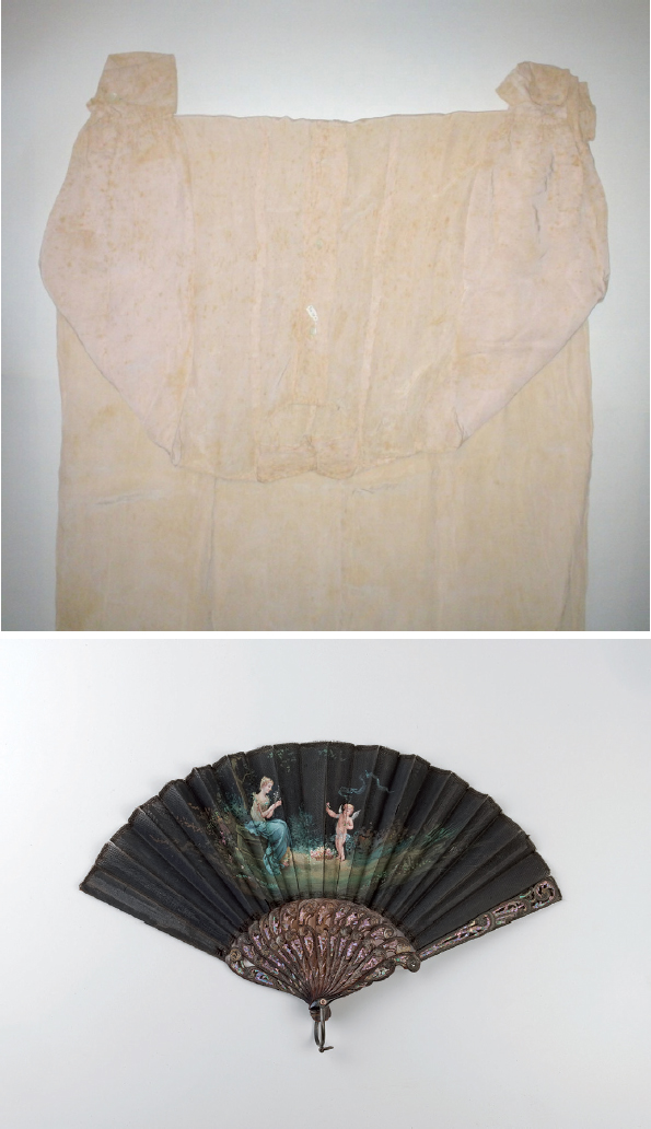 Sabemos apenas que foi a filha de Francisca Rui Barbosa Airosa quem entregou ao MCRB o que designamos provisoriamente como “subconjunto luto” entre os testemunhos da morte do patrono, mas foi um lote em que justamente itens pretos da cultura material da viúva foram doados juntamente com uma camisola sua, sobre a qual nada mais foi informado: 66.882A - Camisola de seda rosa, abotoada na altura do tórax, mangas compridas com abotoamento (Figura 21); 66.889A - Leque preto com quatorze varetas de tartaruga, incrustadas de madrepérola (Figura 22); 66.880A - Vestido de seda preto, com estampado floral branco (Figura 23); e 66.881A - Quimono em seda preta, mangas curtas e faixa para amarrar na cintura, decorada por galhos, folhas, flores, montanhas e barcos bordados em linha branca (Figura 24).