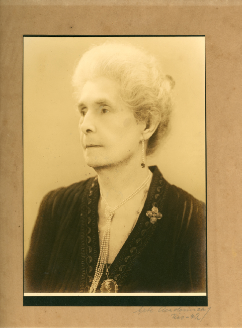 O luto, no caso de dona Maria Augusta, era completado e emoldurado pelo medalhão, incorporado à CRB em 1981, com o rosto mais velho de Rui Barbosa: “81.1069A - Medalhão pingente em ouro, circundado de 42 pedras preciosas roxas. Ao centro retrato de Rui Barbosa (c. 1907) sob placa de vidro em tons de sépia. Entre a foto e a moldura, dois frisos lisos de ouro. Reverso liso”. Na Figura 26, que Maria Augusta levou de presente para sua camareira ao visitá-la, dona Maria Augusta usa essa joia.