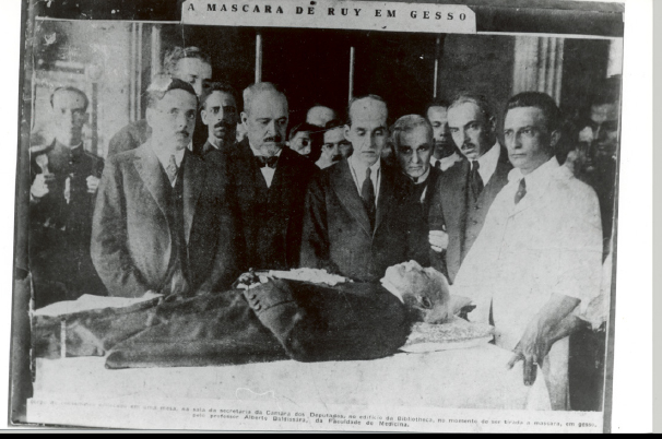 A máscara em bronze, Maria Augusta não quis. Assim que Rui faleceu, foi providenciada uma máscara mortuária. O corpo chegou à Biblioteca Nacional em 2 de março, onde, sobre uma mesa na sala da secretaria da Câmara dos Deputados (Figura 3), que funcionou na Biblioteca Nacional de 1922 a 1926, uma equipe extraiu a forma em gesso que levaria à produção da máscara fúnebre (Figura 4).