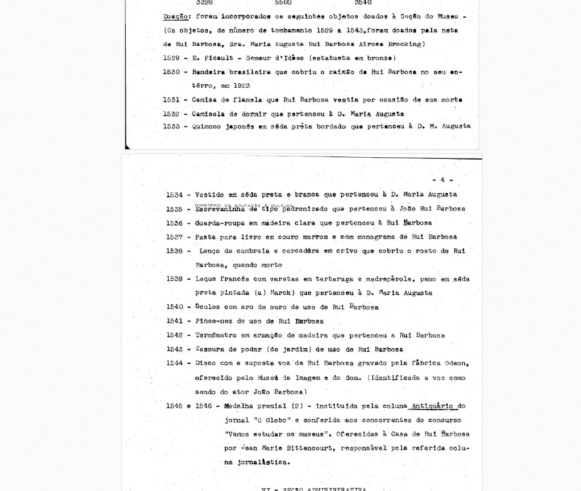 A numeração dos itens seria substituída alguns anos depois por um novo sistema de catalogação. Apesar de fugir ao recorte desta pesquisa, podemos observar, na Figura 5, que o item seguinte ao então nº 1.543 do Livro de Tombo de 1966, que não foi doado pela neta, havia sido o disco long-play preservado na FCRB, que tem gravada no lado B uma saudação do ex-governador Carlos Lacerda sobre o assunto do disco, mas se perdeu preciosa informação dada na aquisição e apenas relatada nesse relatório de atividades da instituição: “identificada a voz como sendo do ator João Barbosa”. Esse trecho consta no relatório, mas não no Livro de Tombo do museu, razão por que a informação havia se perdido, tanto na documentação museológica quanto no tratamento arquivístico da FCRB.