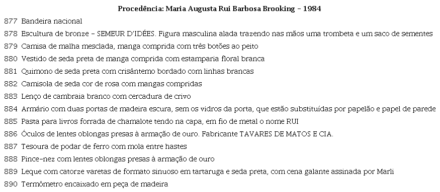 Já no Livro de Tombo do museu em 1984, observamos aquela troca de numeração dos bens, em que os itens 1.529 a 1.543 passaram a ser identificados com os números 877 a 890 (Quadro 2).