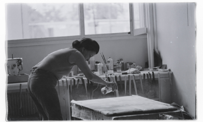 Na fotografia abaixo, datada como de 1961, mas provavelmente anterior a esse período (a artista deixa de realizar pinturas a partir de 1960), vemos Lygia usando tinta spray em uma pintura provavelmente sobre painel rígido em madeira.45 O uso dessa tinta exigia Equipamento de Proteção Individual (EPI), como máscara. Porém, na imagem, vemos a artista sem esse equipamento, ainda que com a janela aberta. Em 1959, a revista Querida lança uma extensa reportagem com a artista, que é registrada pintando obras com EPI; nessa publicação Lygia afirma ter que usar esse equipamento porque a tinta utilizada é “tóxica”6. A imagem ainda comprova o uso de papel jornal e fita adesiva para delimitar as áreas a serem cobertas pela tinta, pincéis e uma máquina (Figura 1).