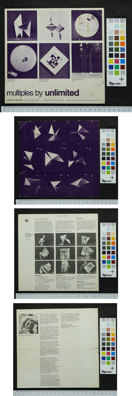 O crítico de arte Guy Brett parece ter sido um dos responsáveis por aproximar a artista de Jeremy Fry. Lygia Clark já se dizia interessada na ideia de Fry em fevereiro de 1968, porém a parceria não foi possível, pois um acordo já havia sido firmado com Claude Givaudan. A fabricação de múltiplos na Inglaterra só ocorreria dois anos depois, em novembro e dezembro de 1970, quando os Bichos são exibidos nas exposições “Three Towards Infinite: New Multilple Art”, na Whitechapel Gallery (Londres/UK) e na já mencionada “Multiples by Unlimited”, na Arnolfini Gallery (Bristol/UK). Em um catálogo de exibição, possivelmente da exposição na Arnolfini Gallery, sem data e organizado pela London Arts Gallery, consta a exibição de “três novos trabalhos” de Lygia Clark identificados como “Animals LC1”, “LC2”, e “LC3” pela “Unlimited”84 (Figura 10).