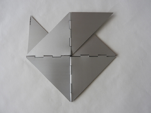 […] na eletrônica, no rádio eu fazia muitos interruptores, e anodizava o alumínio, porque alumínio não anodizado… O anodizado dá uma pequena firmeza. E naquela época havia muita esquadria anodizada, começava. Conheci uma fábrica aí no subúrbio. Mas o problema, antes de anodizar, era como unir essas placas. Aí eu me lembrei de dobradiças, evidentemente. […] É muito simples. Compramos eixos de bicicletas velhas e fizemos assim. Primeiro com a cerinha de aeromodelismo. […] Dobrava assim. […] Aí botava um eixo aqui, com uma martelada […]. E para ficar melhor batia mais num torno […]. Aí cortava. Isso durou nos primeiros Bichos. […] eu reconheço esses [Bichos] feitos com serrote tico-tico, que não são muito perfeitos, um é mais aberto… Anodizamos, ficava uma maravilha.64