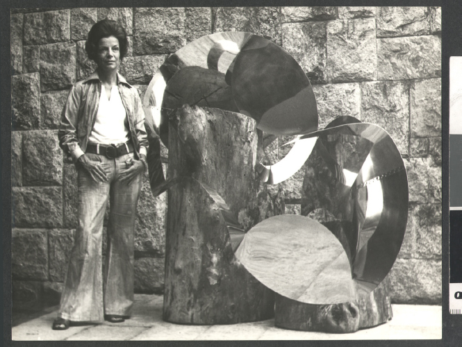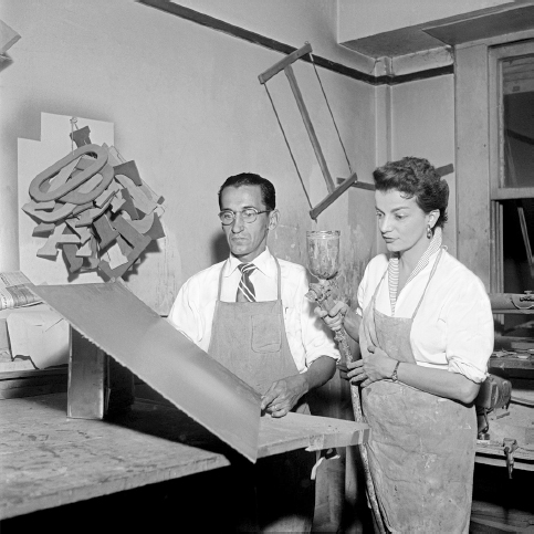 Além disso, é possível inferir que a proximidade da artista com a arquitetura, ou, mais precisamente, com os materiais utilizados na arquitetura, tenha estimulado o uso dessas ligas metálicas. Desde 1956, ela procurava materializar nas maquetes e nos projetos uma “integração” entre a arquitetura e as artes plásticas.16 A artista, além de elaborar maquetes, construiu espaços arquitetônicos, como a vitrine instalada na Associação Brasileira de Imprensa (ABI-RJ). Esse espaço foi integrado com peças de Constantin Brâncusi, Alberto Giacometti e Max Bill.17