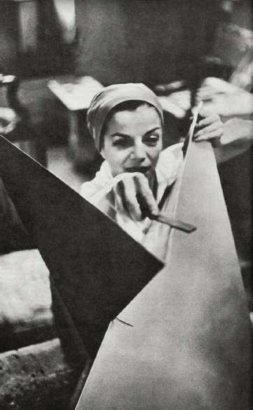 Durante o acabamento das peças a artista recorreu a instrumentos, como a lima, que deveriam remover as marcas do corte e recorte, ou as rebarbas; esse procedimento foi, inclusive, registrado em 1962 pelo fotógrafo Darcy Trigo durante a elaboração de uma obra109 (Figura 7). Além da lima utilizada na espessura das folhas metálicas, a superfície das folhas também era polida com uma lixadeira; o funcionário Sidônio (sobrenome desconhecido) foi um dos responsáveis por esse processo, que, uma vez finalizado, possibilitaria a anodização do alumínio. Segundo Jean Boghici, era necessário “polir para [depois] poder anodizar”110; essa afirmação, ainda que simples, apresenta grande consistência com a ordem de procedimentos necessários para a anodização do alumínio. Essa técnica seria responsável por evitar a formação de riscos e abrasões, pois a camada superficial artificialmente formada apresenta elevada dureza. Contudo, uso constante, a manipulação e o desgaste das folhas umas sobre as outras produziria riscos na superfície; segundo Boghici: “nunca encontramos um material que não arranh[ass]e. Porque o problema da Lygia era também a manipulação”111.