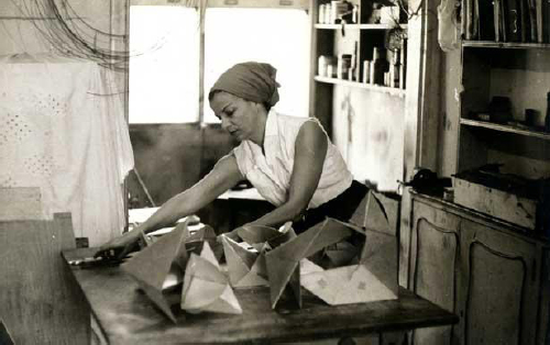 Se nas pinturas sobre compensado a artista investiu no conhecimento de técnicas de marcenaria, nas obras em alumínio e aço inoxidável o interesse avançou para as técnicas de serralheria e funilaria. Em uma correspondência não datada, ao escultor austríaco Franz Weissmann, naquele momento em Portugal, ela afirma estar exausta por ter feito Bichos por “três meses seguidos”29. A Mário Pedrosa, ela relata estar procurando algum profissional especializado no trabalho com os metais. Mário Pedrosa escreve, por sua vez, para Franz, provavelmente para verificar se o artista poderia indicar alguém com conhecimento técnico em metais. Pedrosa relata que a artista já havia começado “a fazer alguns [Bichos] em casa”, pois tinha adquirido maior “noção da técnica de execução” e estava se “tornando mais exigente”30. Porém, de acordo com Pedrosa, ela estava procurando o irmão do escultor, Fritz Weissmann,31 pois enfrentava dificuldades na elaboração da articulação das peças em alumínio e estava à procura de um profissional que “fizesse dobradiças”32.