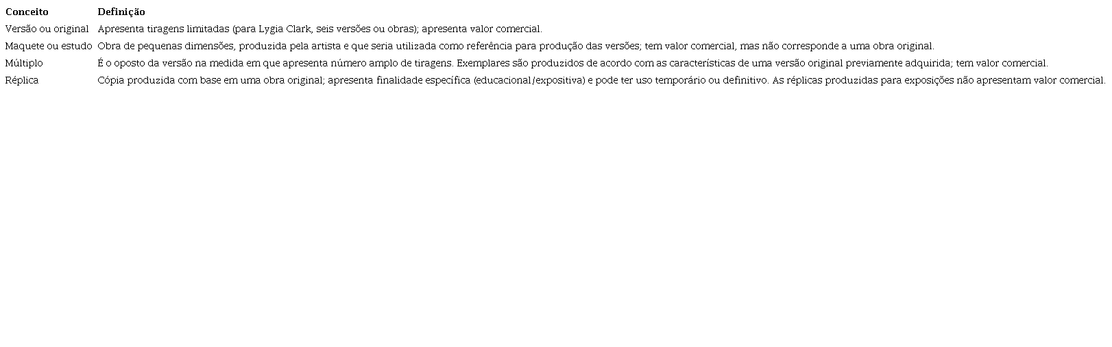 No meio artístico, cabe ao artista determinar um limite de versões ou tiragens. Entretanto, não há um número fixo, e, o artista pode, inclusive, decidir interromper a produção de novas tiragens. No caso de Lygia Clark, a artista produziu até seis versões de cada obra,37 porém nem todos os exemplares foram efetivamente realizados.38 Ela própria afirmava que a variedade de formas e as possibilidades encontradas pelas composições utilizadas nas chapas metálicas não haviam sido completamente esgotadas, mas a artista estava mais preocupada em dar um “salto qualitativo”, do que em “repetir” soluções encontradas: