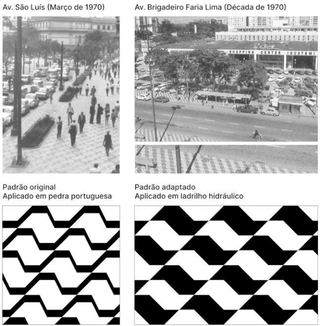 Um fato que passa despercebido na entrevista, assim como na maioria das outras, é a ausência de uma distinção entre o projeto original aplicado em pedra portuguesa e o projeto adaptado para ladrilho hidráulico. Enquanto a própria autora se refere apenas ao primeiro caso, a reportagem cita, contraditoriamente, aplicações de seu desenho na “Avenida São Luís” e na “Avenida Brigadeiro Faria Lima”, dotadas de padrão e material de aplicação diferentes entre si, tal como ilustra a Figura 1.