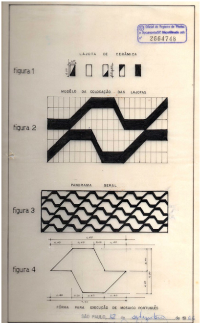 De acordo com as falas de Mirthes,78 a autora foi incentivada pelos colegas da prefeitura a buscar algum tipo de proteção legal para sua obra. Em 12 de setembro de 1966, ainda durante as melhorias da rua da Consolação, a artista depositou seu pedido de patente de desenho industrial.79