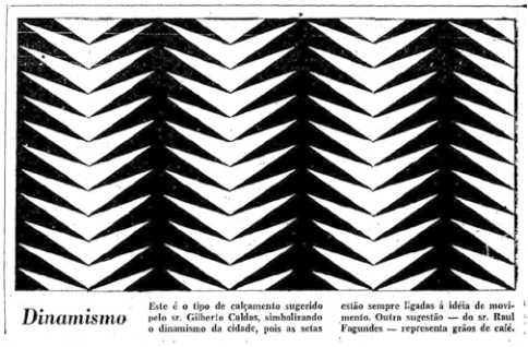 Concomitantemente, o meio artístico discutia duas propostas de calçadas expostas no Ibirapuera. Ambas tinham um elemento central, seguindo a proposta do prefeito de eleger “a marca característica de São Paulo”39. Um modelo apresentava grãos de café - o favorito de Mirthes Bernardes -, enquanto o outro foi elaborado a partir de setas.40